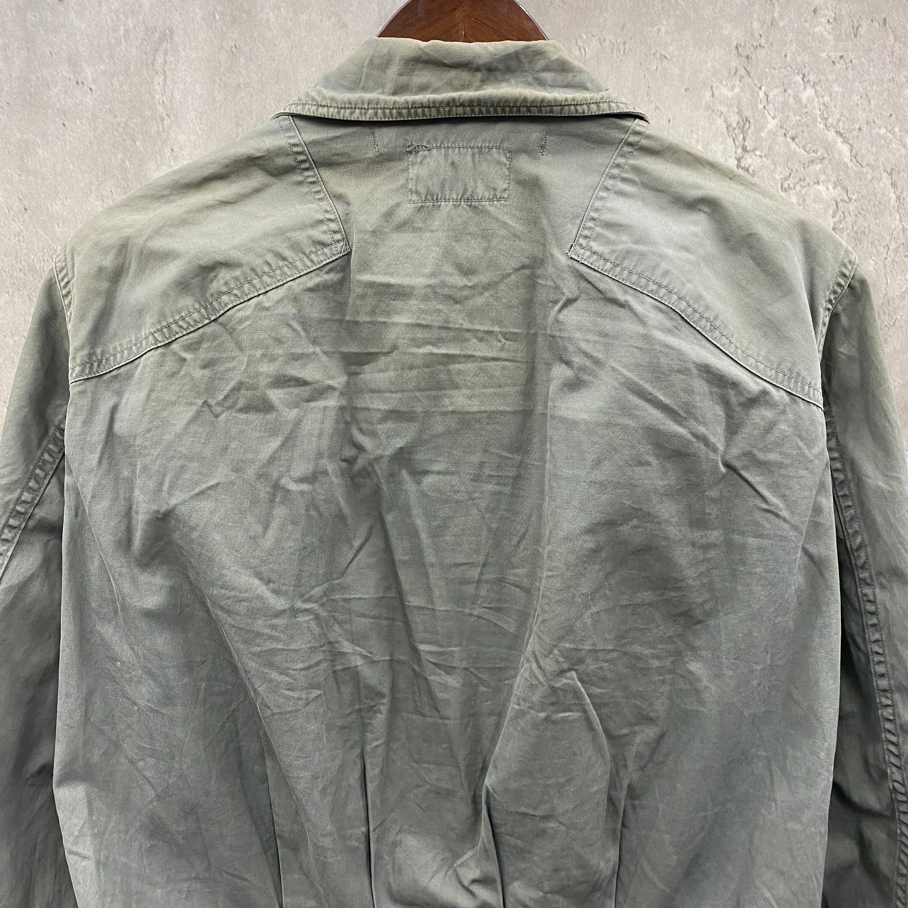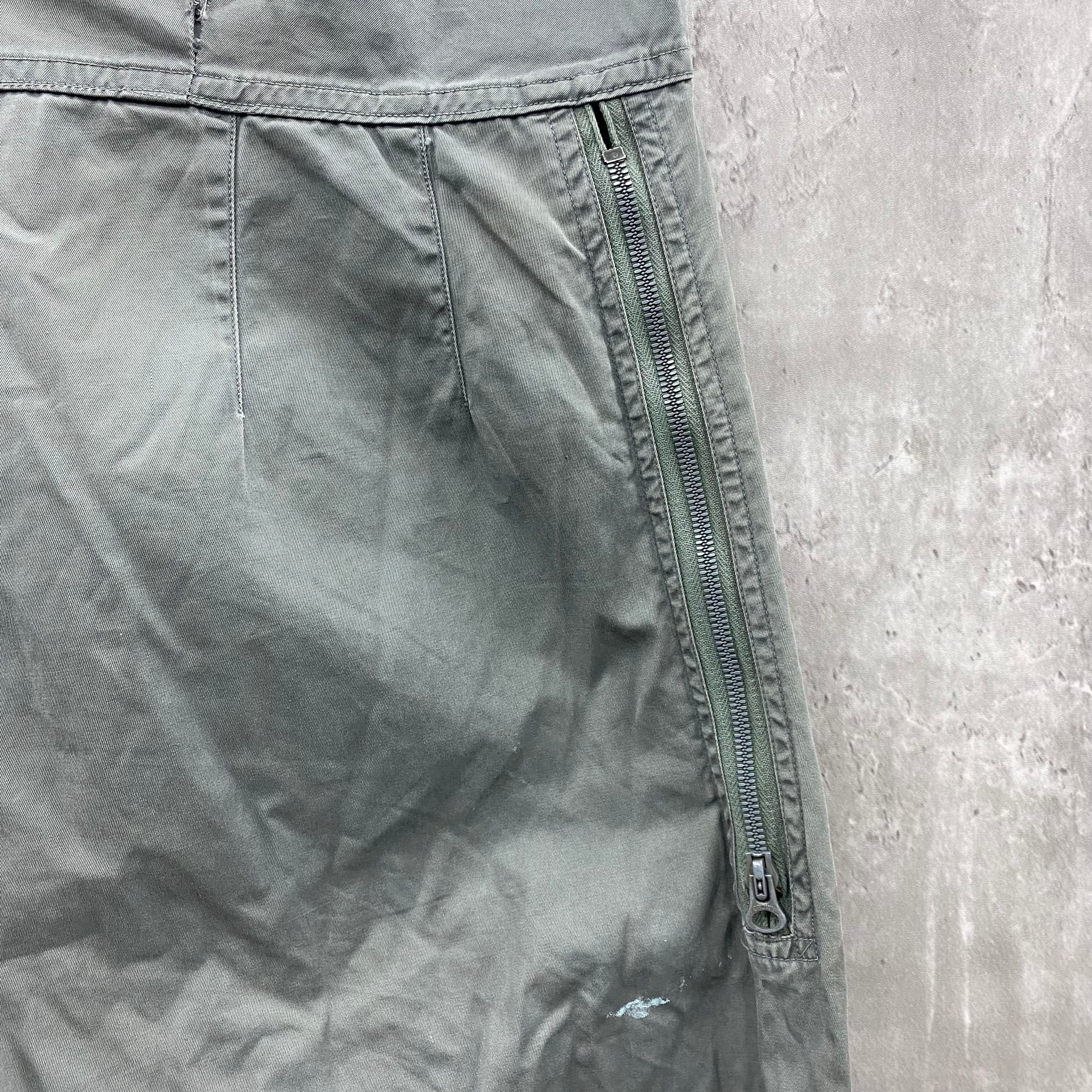 セージグリーン色でボヂィに多数のジッパーがあり、大きめに着用して腰巻きなどがかっこいい一着になります。